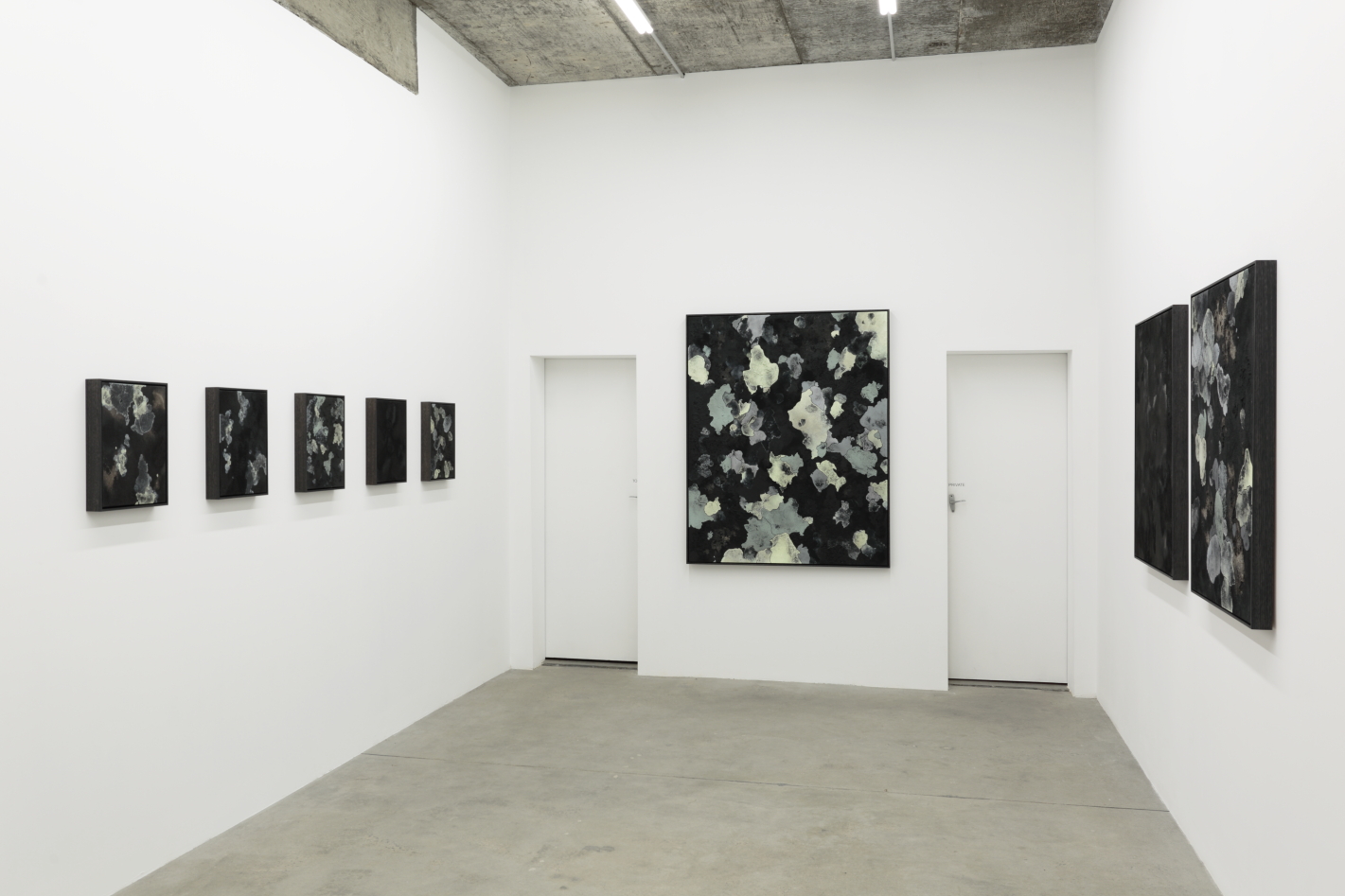 For Time Machine Bae and Lawler draw on the fascinating life of lichen, its unique symbiotic relationship with our environment, and its role as a bio-indicator. Their works emphasise repetition and transformation, combining charcoal, ash, synthetic polymers to create highly textured, patterned surfaces. Bae and Lawler draw on references from the microcosmic patterns of the natural world, to create works that take on a macrocosmic state.